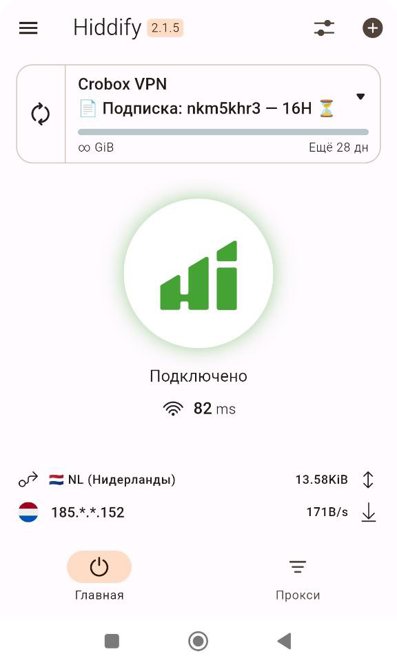 Всё готово! На главном экране появится название вашей подписки и количество дней до окончания. Нажмите большую кнопку для включения/отключения VPN.