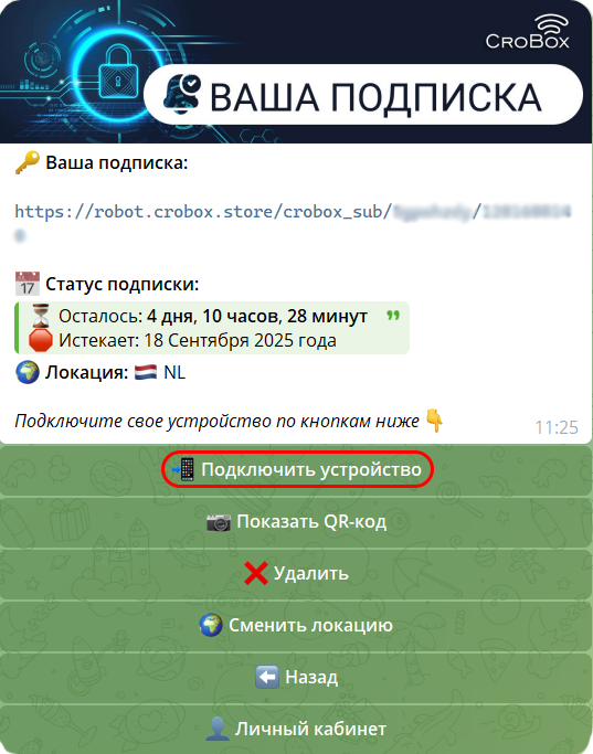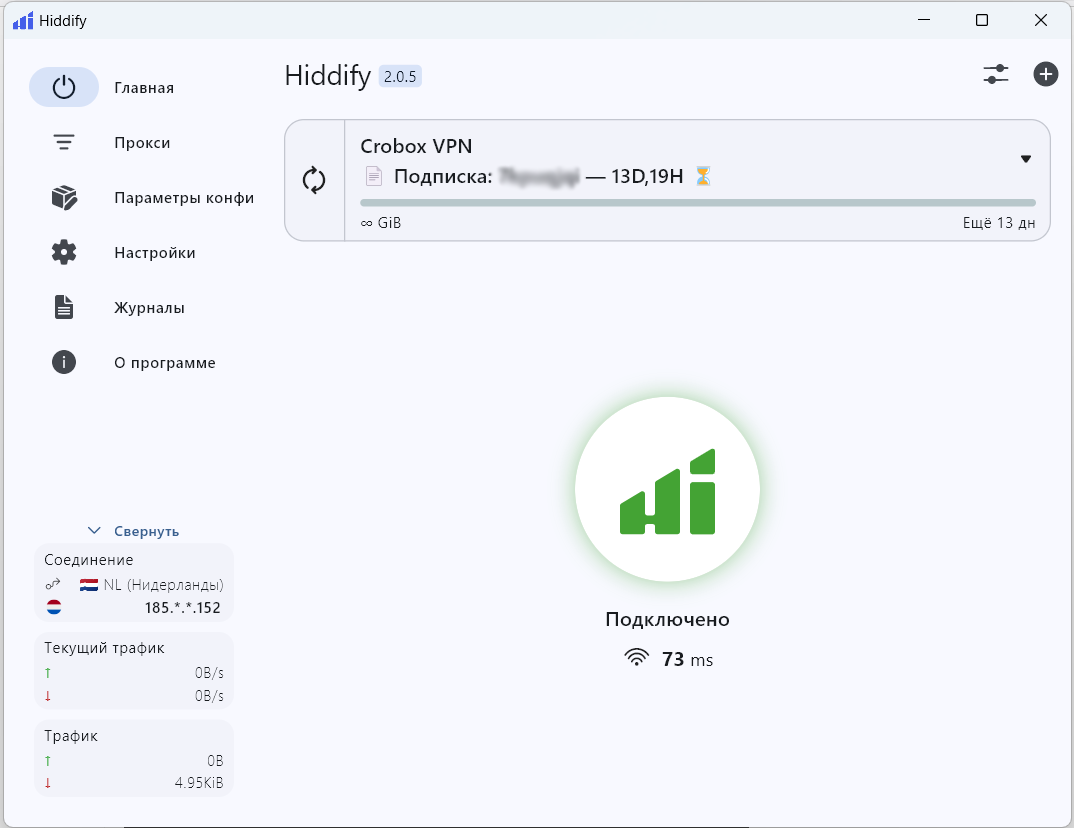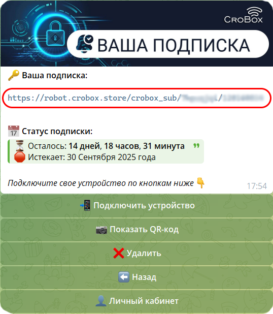 Всё готово! В разделе Конфигурации появится название вашей подписки и количество дней до окончания.