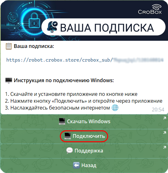 Установка ключа VPN в автоматическом режиме через меню нашего бота работает только при установке приложения Hiddify