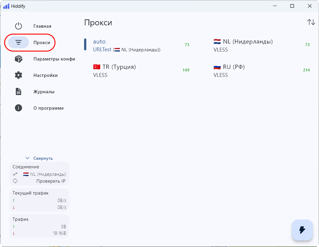 Для изменения страны ПРИ ВКЛЮЧЕННОМ VPN откройте в меню вкладку «Прокси» и выберите нужную локацию.