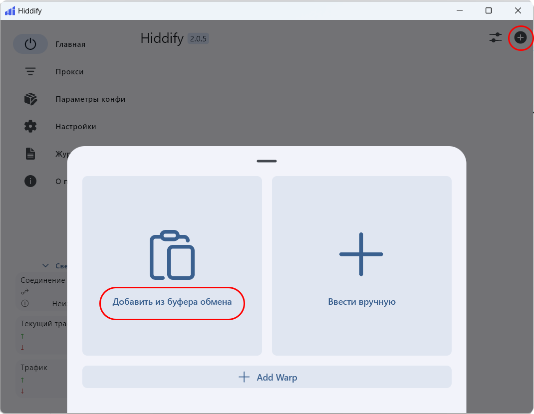 3) Перейдите в скаченное ранее приложение Happ, нажмите на «+» в правом верхнем углу и выберите «Добавить из буфера обмена».